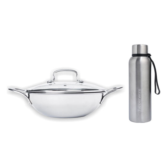 Experience the perfect blend of modern cookware and smart hydration with the Tupperware TRAYAM Kadhai 24 cm (2.6 L) paired with a 700 ml Stainless Steel Insulated Flask.
