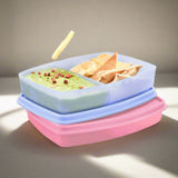 The Tupperware Small Slim Lunch Box is specially designed for quick, cold lunches and snacks. Two compartments in the container can fit in a balanced meal. This lightweight lunch box is slim and compact and will not take up too much space in a handbag, schoolbag or a briefcase. The airtight lid allows you to carry a variety of dry food items in it. So pack a quick sandwich for yourself, and add some fresh fruit on the side. Or pack some poha for your child's tiffin and put in some munchies in the second compartment as a treat. This lunch box is versatile - use it on the go and fill it up with whatever you want!